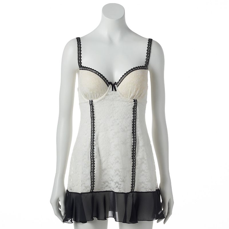 Bring a flirty, feminine look to your lingerie collection with this sheer Jezebel babydoll and panty set. Includes matching bikini panty Sheer tulle Ruffled satin trim Adjustable shoulder straps Front tie closure Fabric &Care Nylon Hand wash Imported Size: Medium. Color: White. Gender: Female. Age Group: Adult. Material: Nylon.