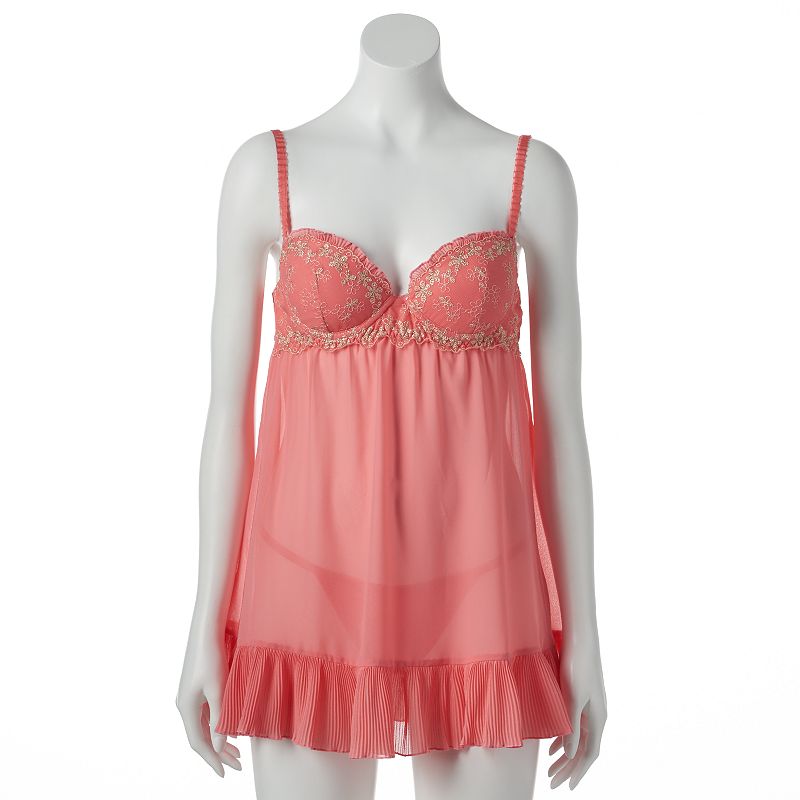 Featuring a sheer pleated design and embroidered cups, this women's Lunaire chemise and G-string lingerie set is a romantic choice. In coral. 2-piece set includes: chemise &G-String Adjustable spaghetti straps Molded, padded underwire bra cups Hook &eye closure G-string: elastic waistband, lined gusset, minimal coverage Fabric &Care Polyester, nylon Hand wash Imported Size: Large. Color: Med Pink. Gender: Female. Age Group: Adult. Pattern: Embroidered. Material: Polyester\/Nylon.