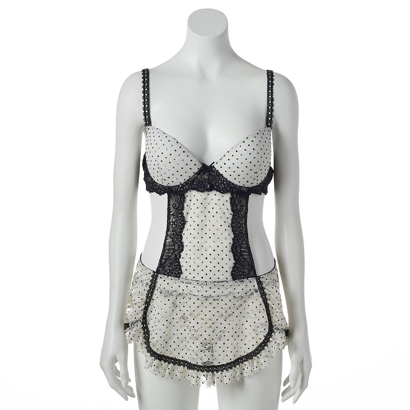 Featuring a lace design and flocked dots, this women's Lunaire apron and G-string lingerie set delivers playful charm. In ivory\/black. 2-piece set includes: Apron &G-String Adjustable spaghetti straps Molded, padded underwire bra cups Hook &eye and tie-back closure G-string: elastic waistband, lined gusset, minimal coverage Fabric &Care Nylon, spandex Hand wash Imported Size: Small. Color: Med Yellow. Gender: Female. Age Group: Adult. Material: Ivory\/Nylon\/Lace.